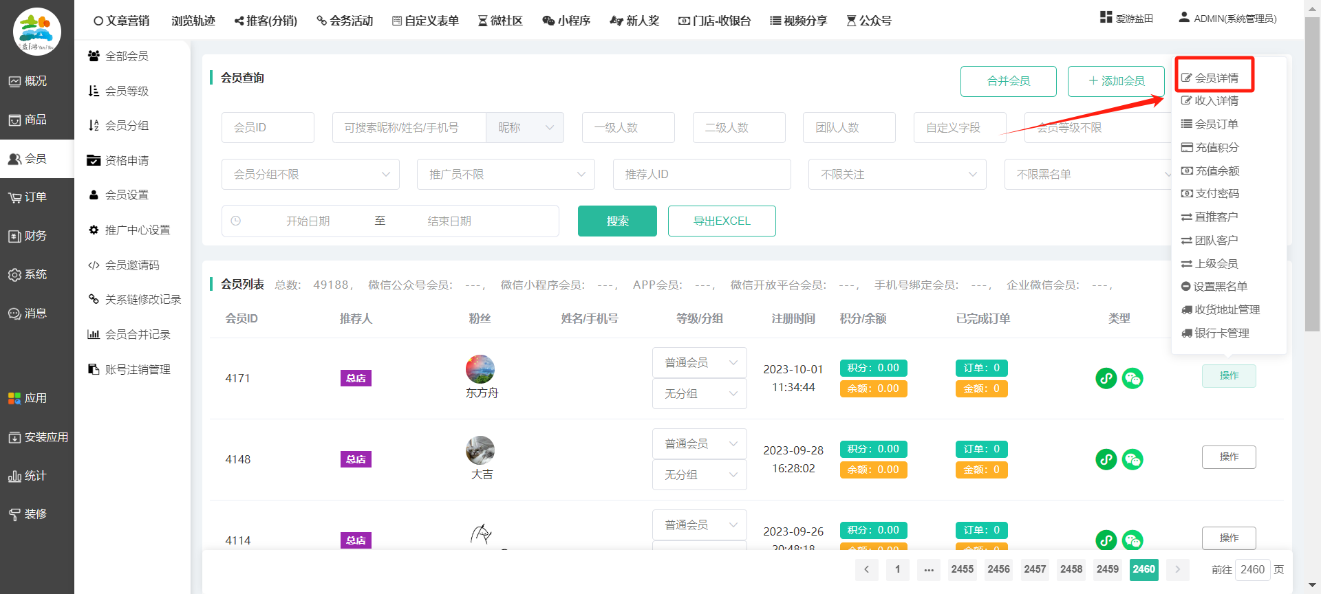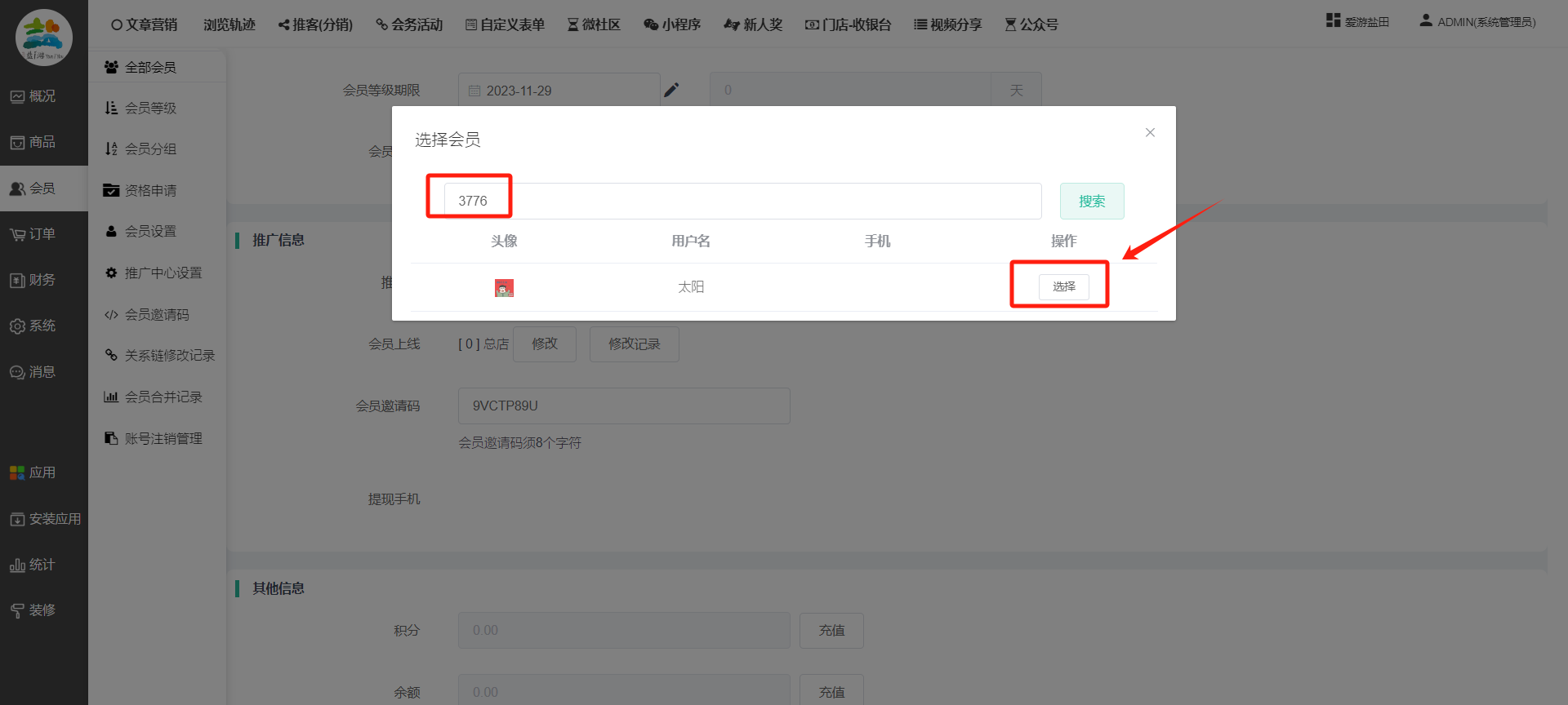 目录 搜索 展开 一、前期准备资料二、数字乡村码-上线操作指南1、服务号的申请流程及认证2、申请小程序流程3、开放平台绑定小程序和公众号三、数字乡村码-系统操作数字乡村码系统管理-概况数字乡村码-商品管理1、发布商品2、商品列表3、商品表单4、商品分类5、品牌管理6、配送模板7、评论管理8、优惠券管理9、商品标签10、退货地址设置11、满额优惠12、批量操作13、配送方式14、基础设置15、商品隐藏四、数字乡村码-会员管理1、全部会员2、会员等级3、会员分组4、资格申请5、会员设置6、推广中心设置7、会员邀请码8、会员关系链修改关系链修改记录9、会员合并记录10、账号注销管理11、会员设置中心五、数字乡村码-订单管理1、订单管理列表2、订单处理流程3、订单状态4、订单修改价格5、订单退款退货6、多包裹发货7、批量发货订单操作步骤8、催发货订单9、物流查询六、数字乡村码-财务管理1、余额设置2、会员余额3、充值记录4、转让记录5、余额明细6、收入明细7、提现设置8、提现统计9、积分管理10、转账审核11、收益广告12、批量充值七、数字乡村码-系统管理1、商城入口2、商城设置①、商城设置②、订单设置③、物流查询④、短信⑤、联系方式⑥、分类⑦、优惠券⑧、分享⑨、幻灯片⑩、广告位⑫、地图设置3、交易设置4、微信模板消息自定义消息模板(新版)自定义消息模板(旧版)小程序消息模板公众号模板消息变更公告5、语言设置6、权限管理7、多媒体管理八、数字乡村码-消息管理九、数字乡村码-应用管理十、数字乡村码系统-数据统计十一、数字乡村码-页面装修DIY1、模板管理2、店铺页面3、顶部导航4、底部导航5、DIY模板市场6、首屏广告7、基础设置8、装修DIY尺寸建议十二、供应商功能插件操作指南1、供应商2、门店-收银台门店申请和使用步骤门店管理①、门店-收银台 营销设置②、门店-收银台 分润设置门店分类门店申请门店审核门店商品门店商品订单收银台订单数据统计核销员基础设置默认设置门店装修3、微社区4、会务活动十三、营销插件操作指南活动报名提货卡新人奖微店问卷调查积分视频分享1、视频分享基础设置2、视频分享发现管理3、视频分享分类管理4、视频分享评论管理5、视频分享分红记录6、视频分享短视频中心每日红包幸运大抽奖签到优惠券二维码任务奖励优惠劵文章音频文章付费文章限时购新海报拓客卡操作流程积分活动素材中心视频红包十四、入驻门店应用类1、门店预约2、附近商品3、门店定位设置4、门店控制5、门店满额包邮6、门店满额减7、导入商品8、门店搜索9、门店股东10、核销券11、多门店核销1、商城后台设置2、前端功能演示十五、常见问题1、后台登录密码修改流程2、会员-余额,积分,后台如何进行充值与扣除3、如何修改上下级关系4、一种万能的获取商城小程序路径的方法 暂无相关搜索结果! 阅读次数:1419 本文档使用 模王系统 发布 8、会员关系链修改 8、会员关系链修改一.如何修改上下级关系?1.会员-全部会员-可以通过搜索用户的独立ID,或者用户微信昵称,找到此会员,然后点击右边的(操作)2.再点击会员详情。3.滑到下面,有个推广信息-会员上线,点击修改4.输入上级的ID号,点击搜索,出来此上级会员后点击选择。5.滑到最下面,一定要点击提交按钮。文档更新时间: 2023-11-30 14:56 作者:链上旅行